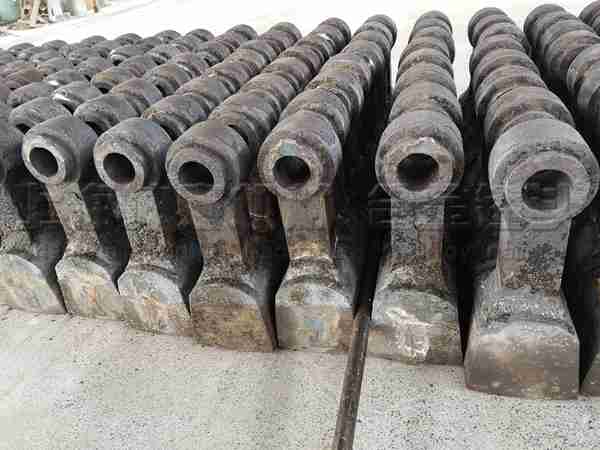 二、設計結(jié)構(gòu)的改進:由于高鉻合金的脆性,需要對錘頭的結(jié)構(gòu)進行改進:① 將可能引起錘頭應力集中的方形螺栓孔改為圓形或橢圓形螺栓孔,以減少錘頭在使用中的開裂現(xiàn)象;② 破碎機錘頭廠家將較長的錘頭從安裝孔中間斷開,并在不影響破碎效果的前提下預留安裝間隙,以減小彎矩,降低錘頭安裝面的尺寸和形狀要求,并使錘頭結(jié)構(gòu)在轉(zhuǎn)子安裝過程中更加穩(wěn)定。